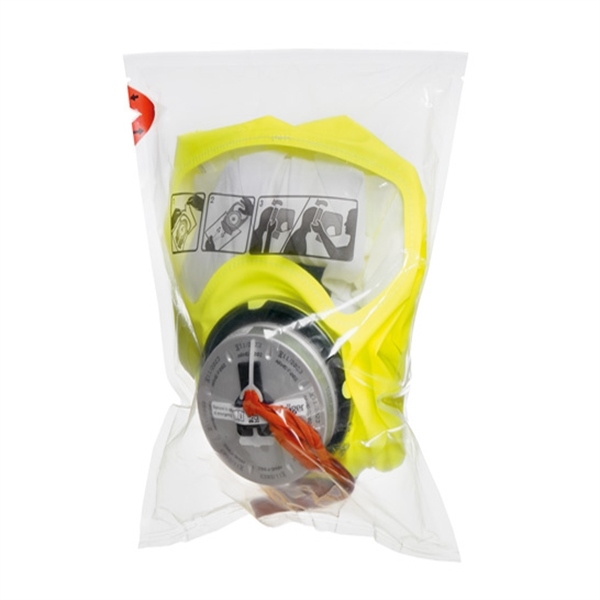 Dräger PARAT 5550 sistem çözümü, yangın kaçış başlığının taşınmasını, açılmasını ve takılmasını basitleştirir: Taşıyan kişi kılıfı açar, kaçış başlığını içeren folyo torbayı çıkarır, eldiven takarken bile deliklerinden kolayca açar ve kurtarılan kişinin takmasına yardımcı olur. Net şekilde görülebilir resimli talimatlar, takma prosedürünü gösterir.